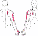 The muscles involved with poor breathing techniques are the scalene muscles. These muscles are in front of the neck and attach the neck to the upper rib cage. The "X" is where the trouble in the muscle is and the red areas are where pain or numbness may result |
