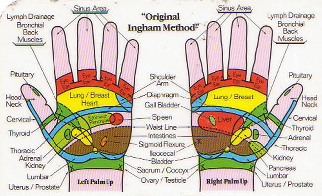 According to reflexology by applying pressure to a specific part (the foot/hand/ear is broken up into different point which if stimulated correctly directly corollate to another body system or organ) the body will naturally begin to heal itself. Reflexology has also been called "Zone therapy"